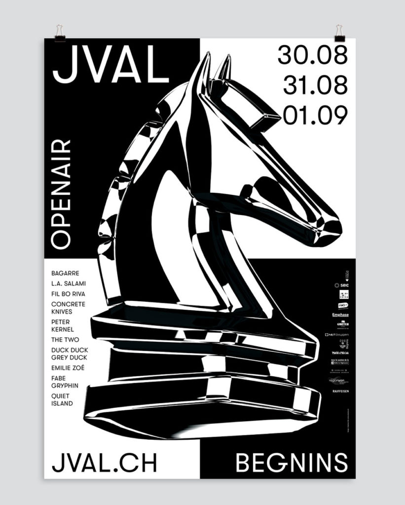 Pour ceux qui connaissent l’histoire de notre nom, l’affiche est un retour aux sources: le cheval, dit en bon vaudois «le j’val». Mais attention, exclu d’avoir un coup de retard! Pour cette affiche 2018, EMPHASE a voulu damer le pion aux critiques faciles: sur le thème de la partie d’échec, notre cheval fringant sera prêt à danser sur les sonorités et styles des différents groupes au programme. Car oui, l’affiche sera animée sur la plupart des supports, tels les réseaux sociaux. Il se murmure même qu’une expérience en réalité augmentée se prépare en coulisses…
