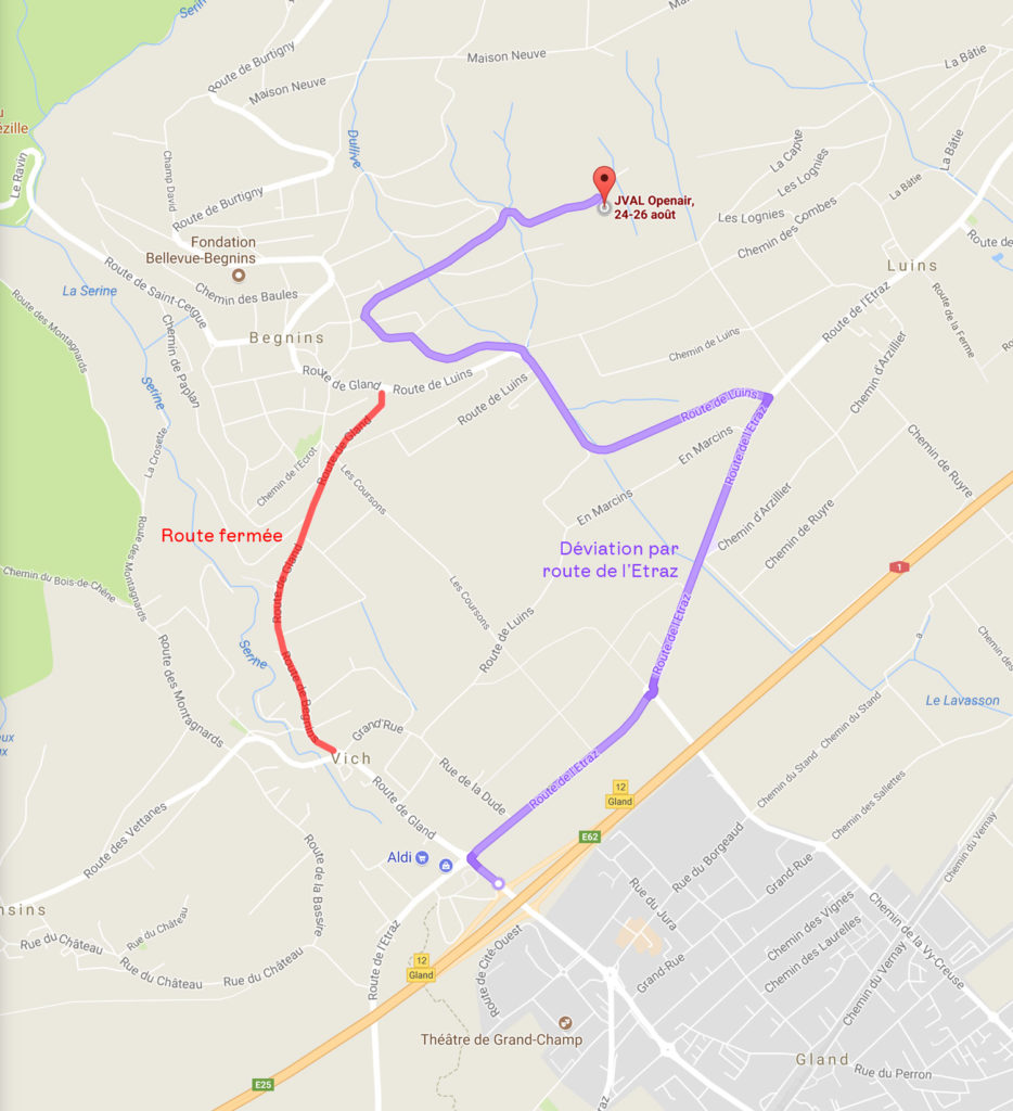 Des travaux ferment actuellement la route entre Vich et Begnins (pendant plusieurs mois). Ceux-ci obligeront nos festivaliers motorisés à prendre un itinéraire bis pour se rendre au JVAL Openair. Pas de panique: une signalisation a été mise en place dès la sortie de l’autoroute à Gland, guidant les véhicules sur la déviation par la route de l’Etraz. Plus d’infos sur ces travaux dans l’article de La Côte.