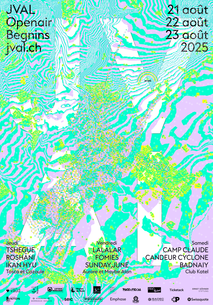 Teintées de couleurs estivales, ces lignes sinueuses évoquent aussi les vibrations sonores qui s’emparent de tout un village, le temps d’un festival. La topographie devient mélodie et le paysage un écrin indissociable du JVAL Openair.